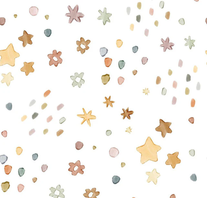 El complemento indispensable. Esta tela presenta un patrón juguetón de motas de acuarela y estrellas en tonos tierra, salvia y azul. Es un básico lleno de estilo que añade color sin sobrecargar el diseño. Es el mismo tejido de algodón 100% de gran calidad, ligero y suave, que asegura un acabado profesional.